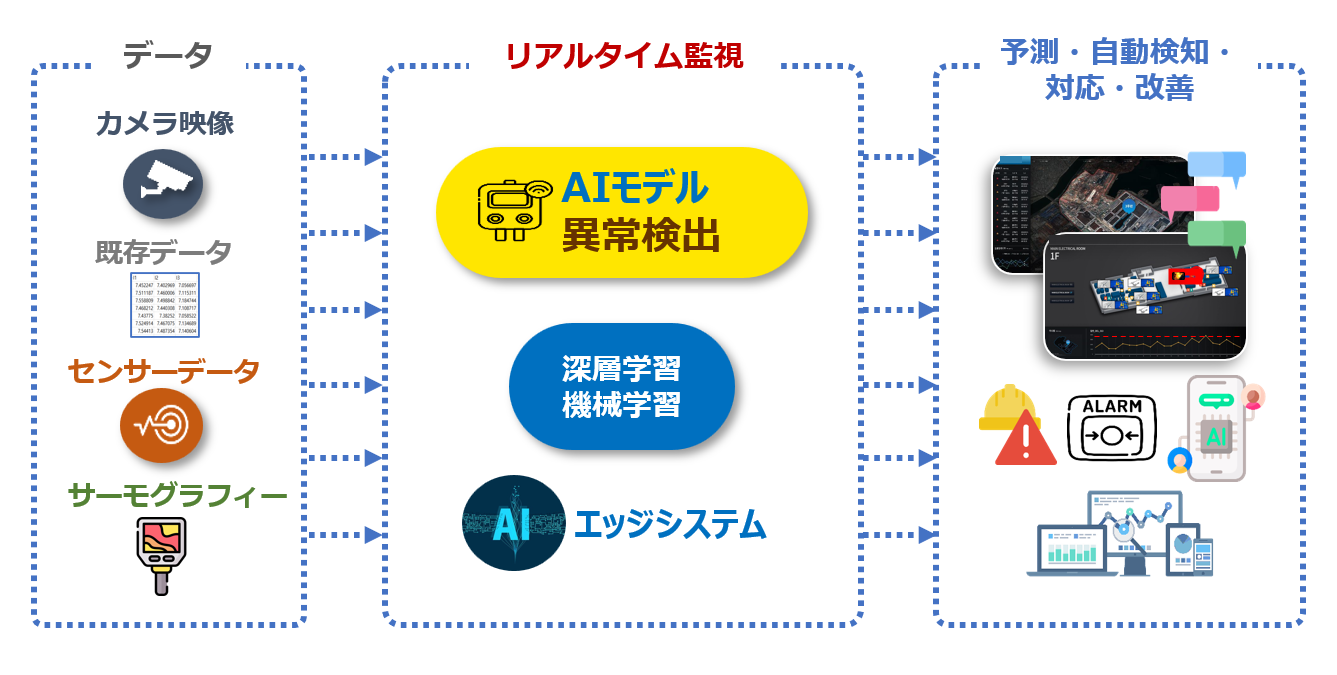 プロテクトゴー(Protect Go)AIとは、あるゆる現場や施設での各種設備・インフラから収集した現場データ又は、IoTセンサー、動画、画像データなど様々なデータを基に、クラウド型・オンプレミス型・On Device/AIエッジ型のシステムを提供し、現場での事故や異常を未然防止又は迅速な検出を行うAI基盤モデル搭載のスマートソリューションです。 製造現場を含む全ての産業・ライフラインインフラの老朽化及び災害対策に悩まされている自治会等向けにスマートソリューション(例:スマートファクトリー、スマート建設、スマートシティ・・・)の実現をサポートします。